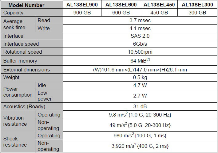 Toshiba так же отмечает, что новинки имеют увеличенную скорость передачи данных на 32%, ёмкость на 50% и снабжены технологией Dual-Stage Head Positioning Actuator, которая обеспечивает более стабильную работу устройства. Объем новинок может достигать 900 Гбайт, когда скорость вращения шпинделя для всех представленных устройств составляет 10500 оборотов в минуту.